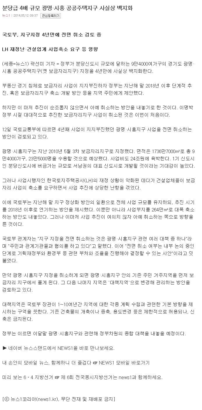 ºÐ´ç±Þ 4¹è ±Ô¸ð ±¤¸í¡¤½ÃÈï °ø°øÁÖÅÃÁö±¸ »ç½Ç»ó ¹éÁöÈ